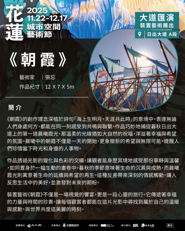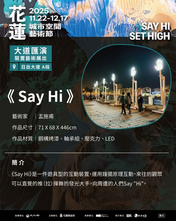 當太平洋的風輕拂、遠山染上晨光, 藝術在這座城市緩緩甦醒。 第六屆《花蓮城市空間藝術節》以主題 「Say Hi → Set High」 出發—— ∎ Say Hi to Hualien → Set High for the Future ∎ 從花蓮出發,迎向更高的城市、文化與生活藝術高度 ∎ 海的廣闊,帶來心的開闊;Say Hi 就能 Set High 三大高度,構築花蓮的藝術地景: ➤ #城市的高度|山海共生的壯闊城市,蘊含自然與城市共生的力量,展現出屬於東台灣獨特的城市高度。 ➤ #文化的高度|原民、客家、閩南與移民文化等多元交織,成為花蓮在台灣文化地圖上的高峰。 ➤ #生活的高度|花蓮的日常,就是藝術;從飲食、工藝到音樂與市集,生活即是最動人的藝術展演。 從【日出大道】的藝術裝置及匯演、【日出舞台】的晨光演出、 到【響應串聯】藝術走進店家、【周邊配合】至各鄉鎮開設講座及演出 花蓮以自然為舞台、以藝術為語言,邀你一起在山海之間「Say Hi」, 讓城市、文化與生活,一起「Set High」! #花蓮城市空間藝術節 活動時間| 2025.11.28 -2025. 12.17